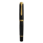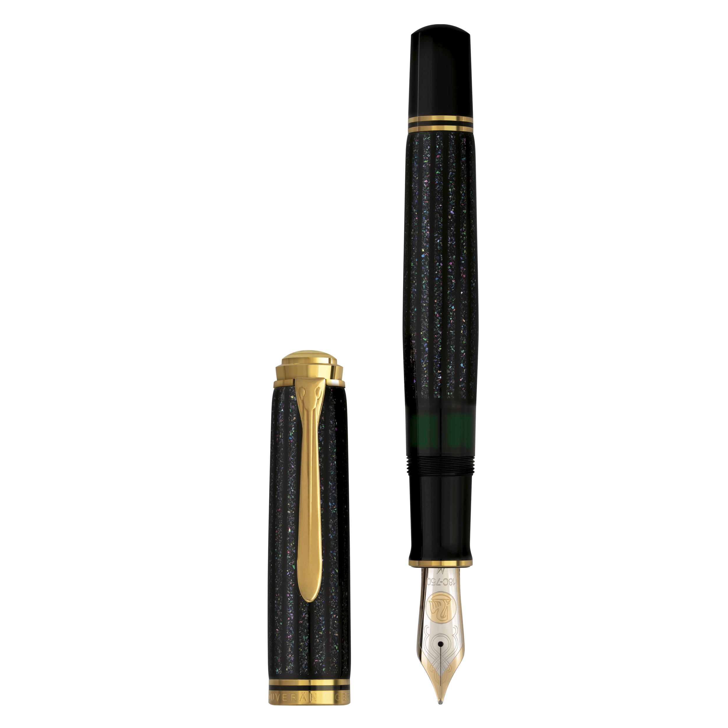 Die zarten Raden-Elemente werden von mehreren Schichten klaren Lacks umhüllt, sorgfältig poliert und perfektioniert, bis ein brillanter, glasiger Glanz entsteht. Vollendet wird das Schreibgerät durch edle, 24-karätig vergoldete Akzente, darunter der ikonische Pelikan-Clip und doppelte Zierringe, die dem Füllhalter eine Aura zeitloser Eleganz verleihen. Der limitierte Füllhalter ist zudem mit einer luxuriösen 18-karätigen Goldfeder in der Strichbreite M ausgestattet.