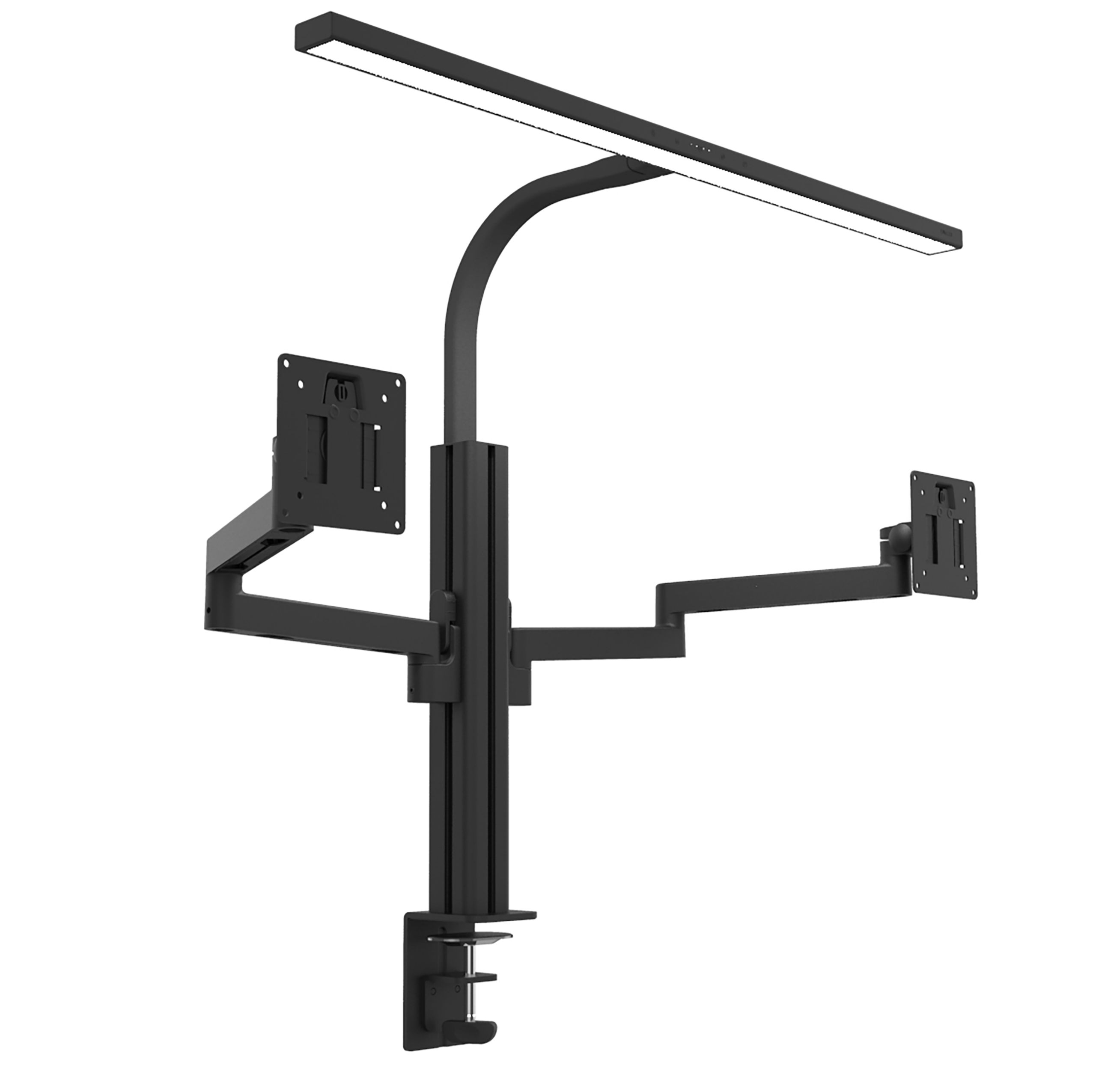 Dieses Set vereint den AXIO Doppel-Monitorarm mit der STRATA-Leuchte und bietet eine effiziente Kombination aus ergonomischer Bildschirmpositionierung und hochwertiger Arbeitsplatzbeleuchtung. Die STRATA verfügt über einen flexiblen 70 cm hohen Schwanenhals, der Rotation, Neigung und Schwenkung der Leuchte ermöglicht, sodass der gewünschte Arbeitsbereich optimal ausgeleuchtet wird. Mit dem 80 cm breiten Kopf sorgt die Leuchte durch ihre asymmetrische Lichtverteilung für eine gleichmäßige, blendfreie Ausleuchtung der Arbeitsfläche bis an die Schreibtischkante. Helligkeit und Farbtemperatur lassen sich individuell anpassen; optional kann ein integrierter Umgebungslichtsensor die Lichtintensität automatisch an die Umgebungshelligkeit anpassen.