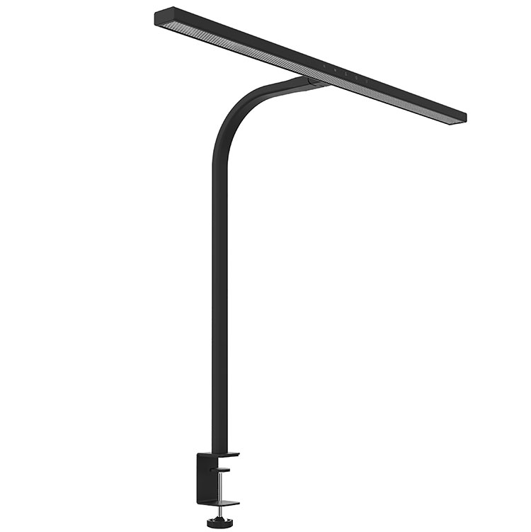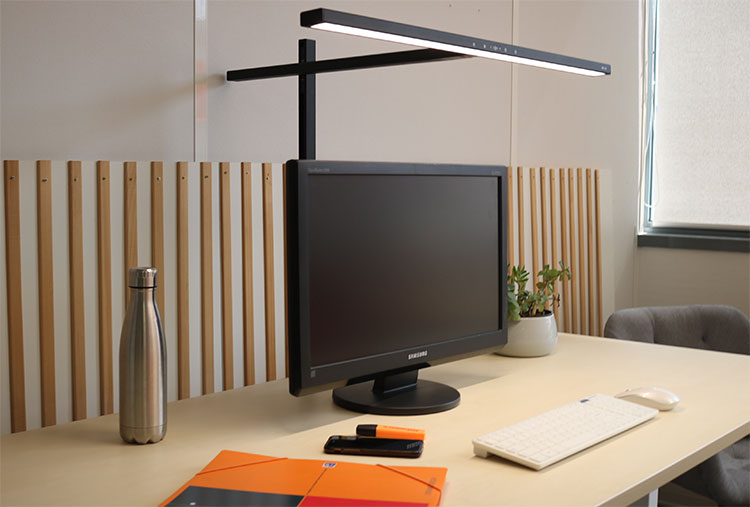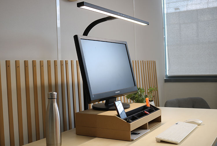 Die zwei Schreibtischlampen sind jeweils mit einem 80 cm breiten Leuchtenkopf ausgestattet und sorgen für eine gleichmäßige, asymmetrische Ausleuchtung des gesamten Schreibtisches bis zum Rand. Blendungen werden reduziert, relevante Arbeitsbereiche gezielt ausgeleuchtet und die Augen spürbar entlastet. Über einen integrierten Farbtemperaturregler lässt sich das Licht in vier Stufen an unterschiedliche Tätigkeiten anpassen, etwa für konzentriertes Arbeiten, Lesen oder kurze Pausen. Dank der platzsparenden Tischklemme lassen sich beide Lampen unauffällig hinter dem Monitor befestigen und eignen sich auch für Multi-Monitor-Arbeitsplätze. Ein weiteres Plus: Der Lampenkopf und Arm bestehen jeweils aus recyceltem Aluminium und unterstreichen den nachhaltigen Anspruch der Leuchten.